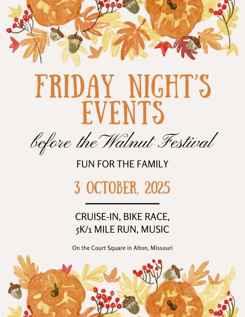 Just over a month until Alton’s 40th Black Gold Walnut Festival!! We are looking forward to a two days of great events, food, and music. Hope to see you there.